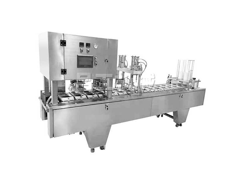 本機(jī)采用合理的機(jī)械傳動,功能齊全,灌裝、封口、切邊、制品推出,廢料收卷,印碼等自動化工作,可節(jié)約人力,降低成本。本機(jī)有二次熱封裝置,料杯/碗/盒與封膜經(jīng)過前后二次熱封,封口牢固可靠。